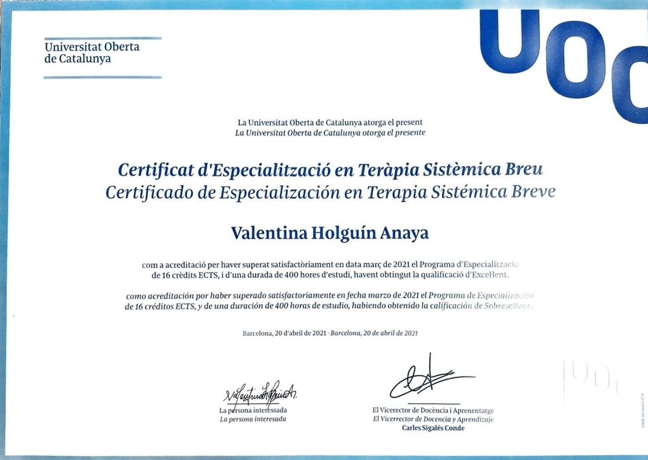 - Universidad Oberta de Catalunya, 2021 Especialista en Terapia sistémica Breve